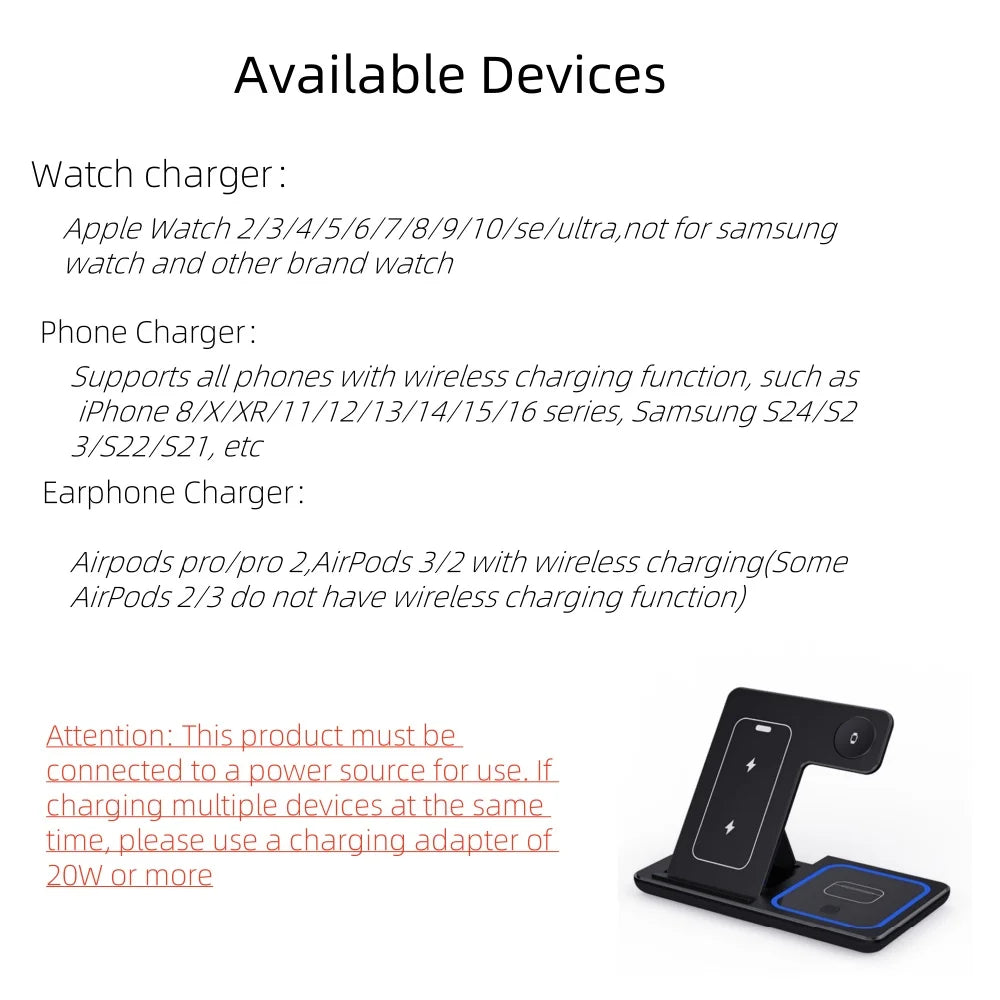 Streamline your tech ecosystem with this sophisticated multi-device charging solution. Featuring intelligent power distribution, it simultaneously charges your smartphone (5W–15W), Apple Watch (3W), and AirPods (5W) with precision magnetic alignment. The integrated smart chip delivers comprehensive protection against electrical hazards—including overvoltage, overcurrent, thermal stress, and short circuits—guaranteeing safe, uninterrupted charging cycles. Manufactured from durable ABS with an illuminated status indicator, this QI-certified platform maintains exceptional 75%+ energy efficiency across its 6mm transmission window. Meets RoHS and CE regulatory standards. Includes Type-C cable and user guide. For simultaneous three-device charging, use a QC 3.0 power adapter to maximize performance.